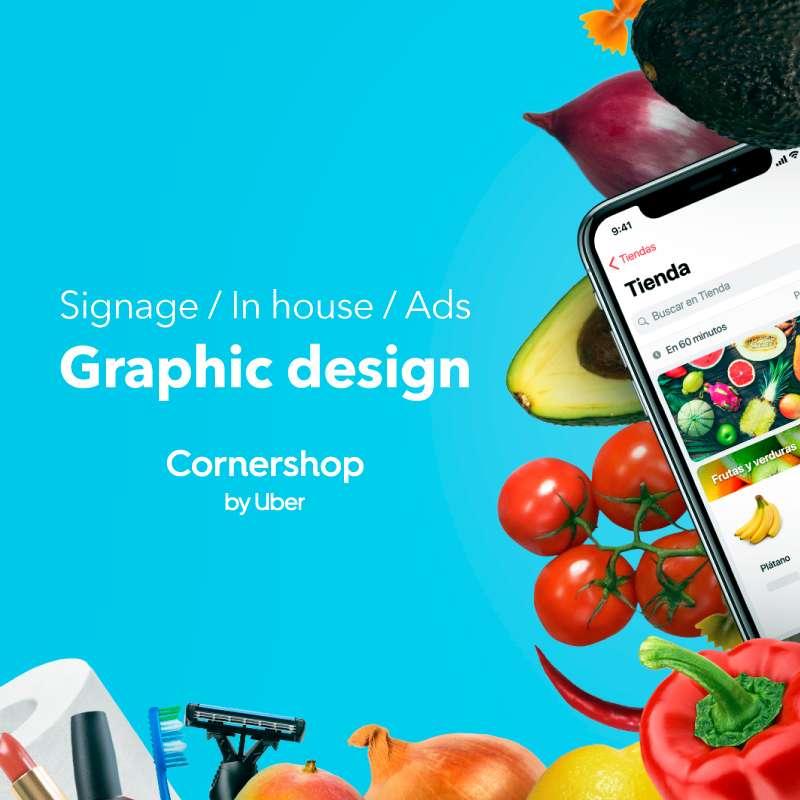 A sample of icons, ads, designs and prints created for Cornershop by Uber.